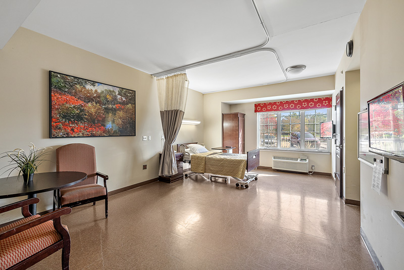 Maple Manor feels like a hotel. The interior is decorated with soothing artwork, modern appointments and a restaurant style food service. A family member may stay overnight in a patient’s private suite, which includes a dining table, chair, love seat, refrigerator and roll-in shower. There is technology center, work stations, Wi-Fi throughout, a beauty and barber shop, a library and TVs.